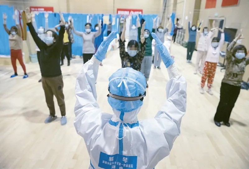 武漢江夏方艙醫(yī)院是武漢市首個以中醫(yī)院運轉模式來進行臨床治療、管理的方艙醫(yī)院。除了施用中藥湯劑,江夏方艙醫(yī)院的醫(yī)護人員還教患者習練太極拳、八段錦疏通經絡、調理氣血,并采取了溫灸、耳穴壓豆、經絡拍打等中醫(yī)綜合治療手段。圖為2020年2月25日,湖南中醫(yī)藥大學第一附屬醫(yī)院醫(yī)護人員在江夏方艙醫(yī)院帶領新冠肺炎患者習練八段錦。 新華社記者 沈伯韓/攝